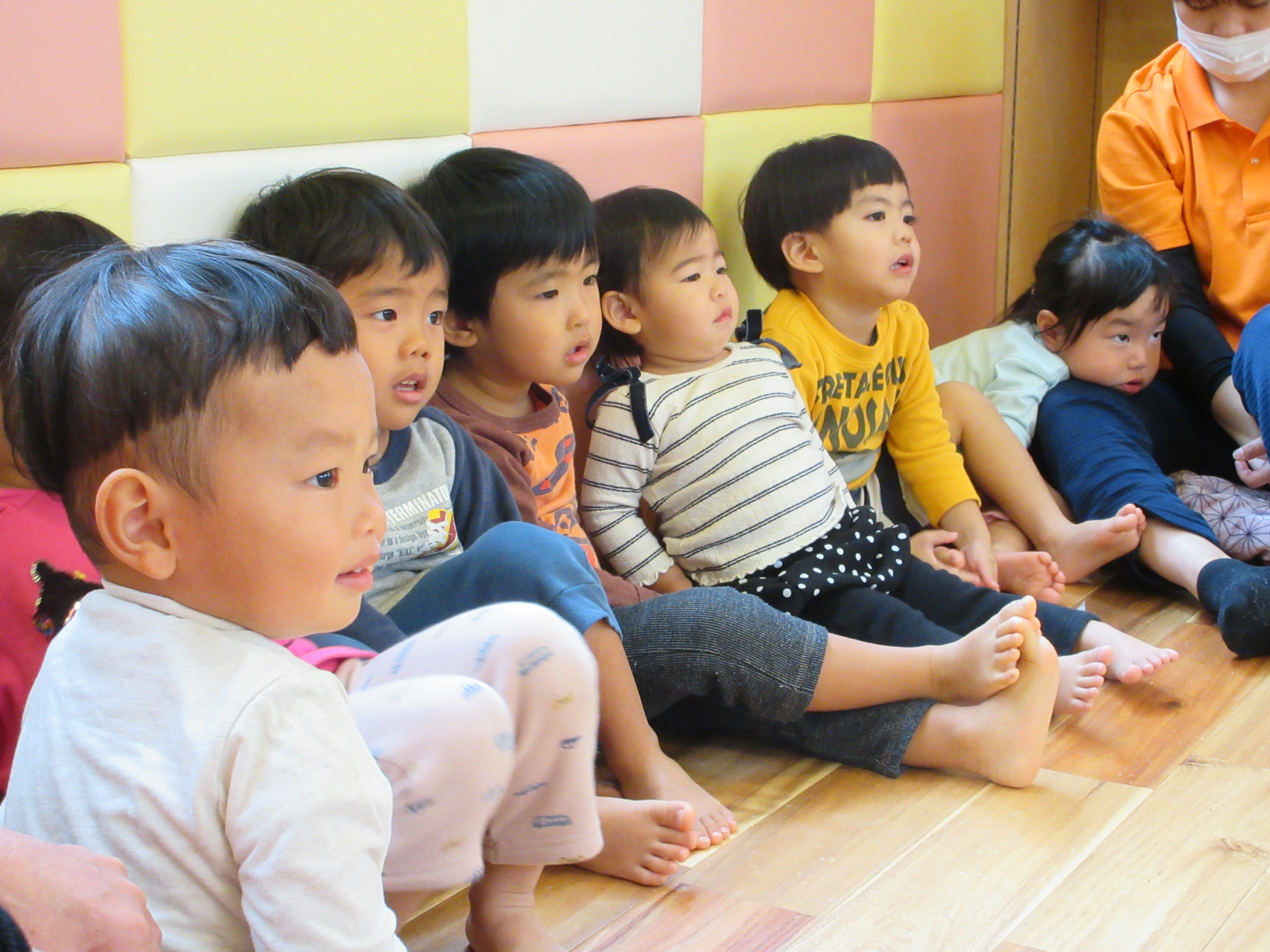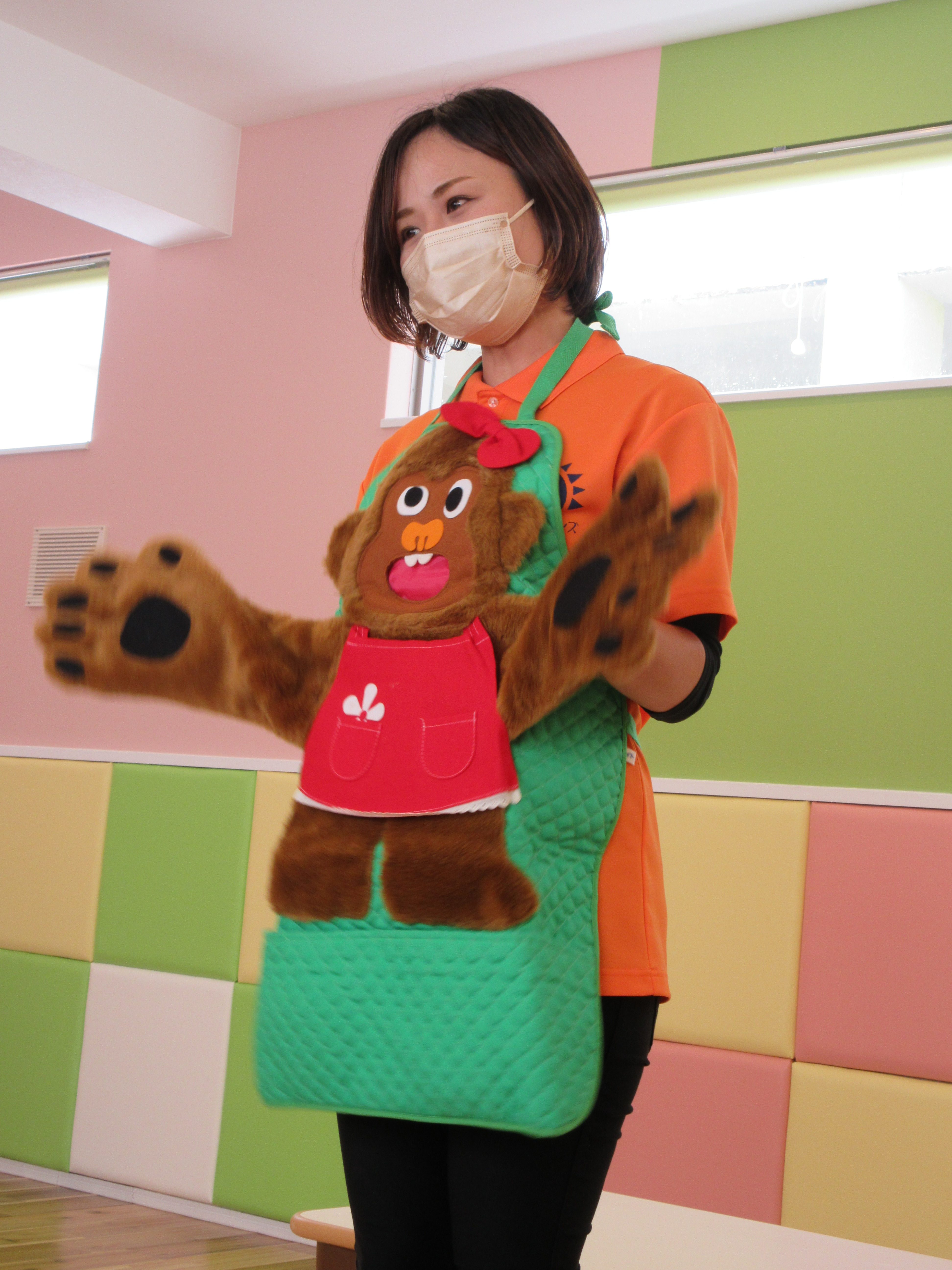 いつもの手あそびうたですが、大きなゴリラが出てきて子どもたちはびっくり![]()
