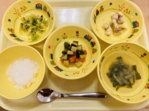 粥 味噌汁 野菜のコロコロ煮 ツナとキャベツの和え物 バナナ