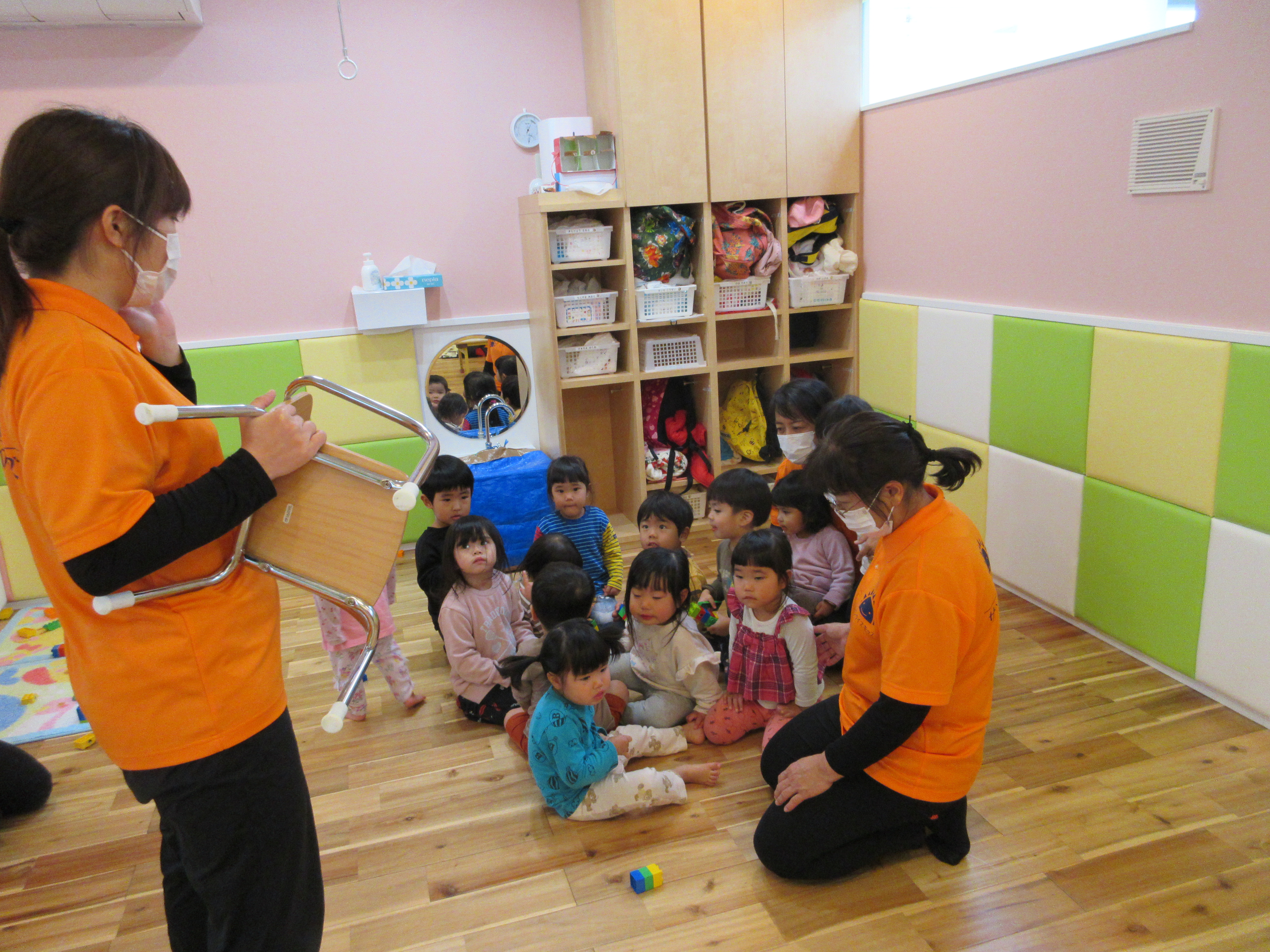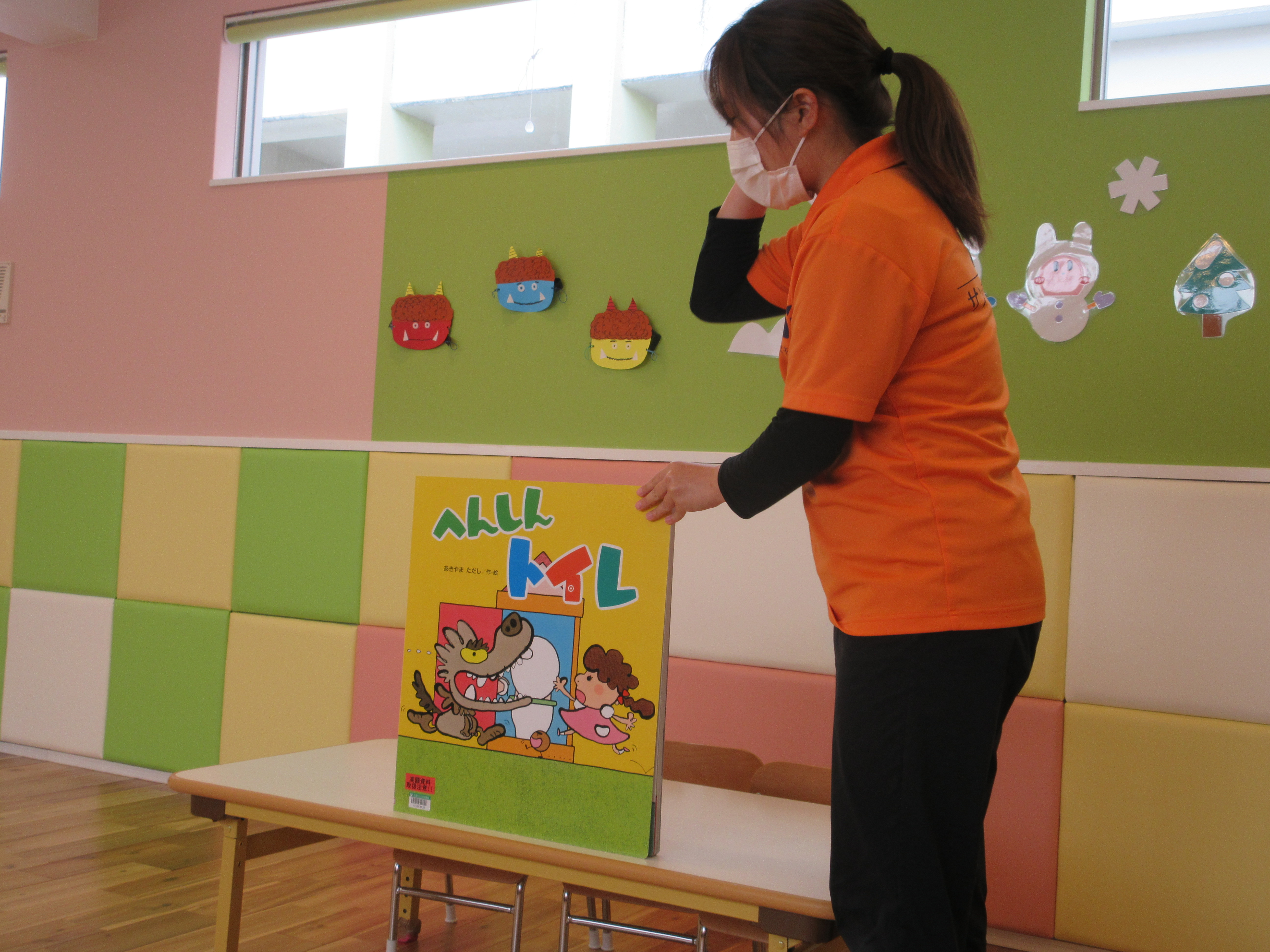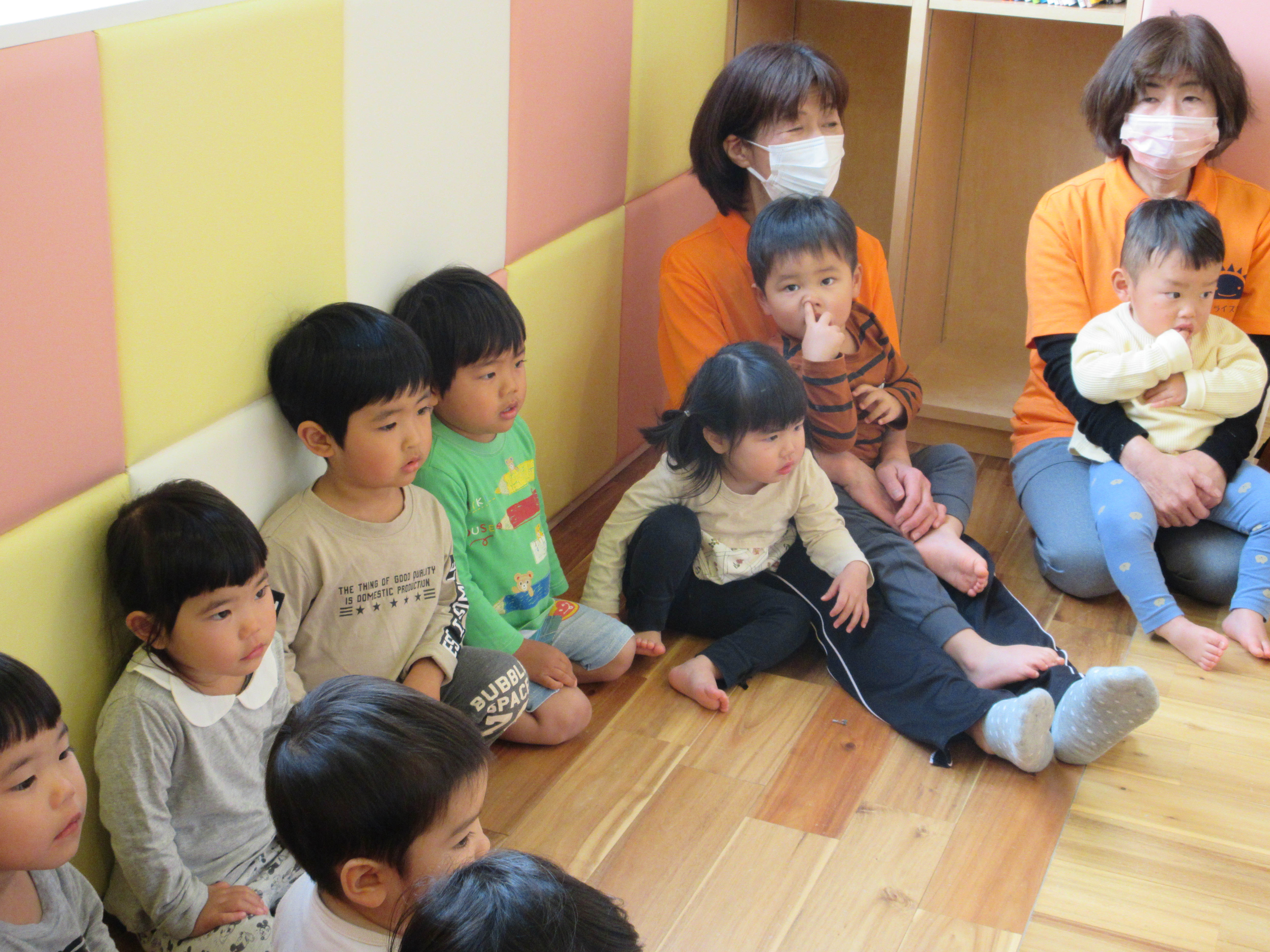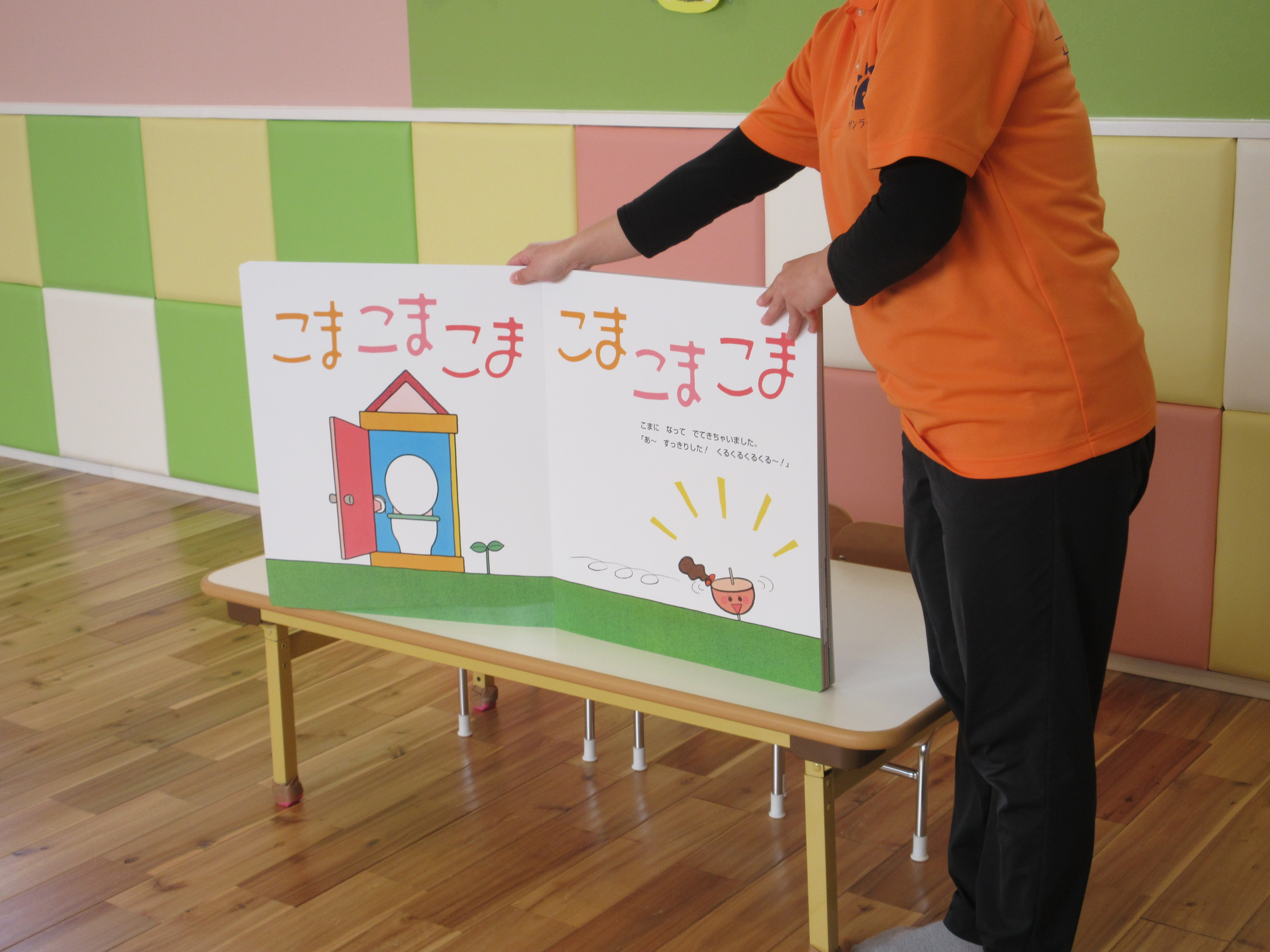 大型絵本『へんしんトイレ』のお話です。大きな絵本に子どもたちは目を丸くして見ていました![]()