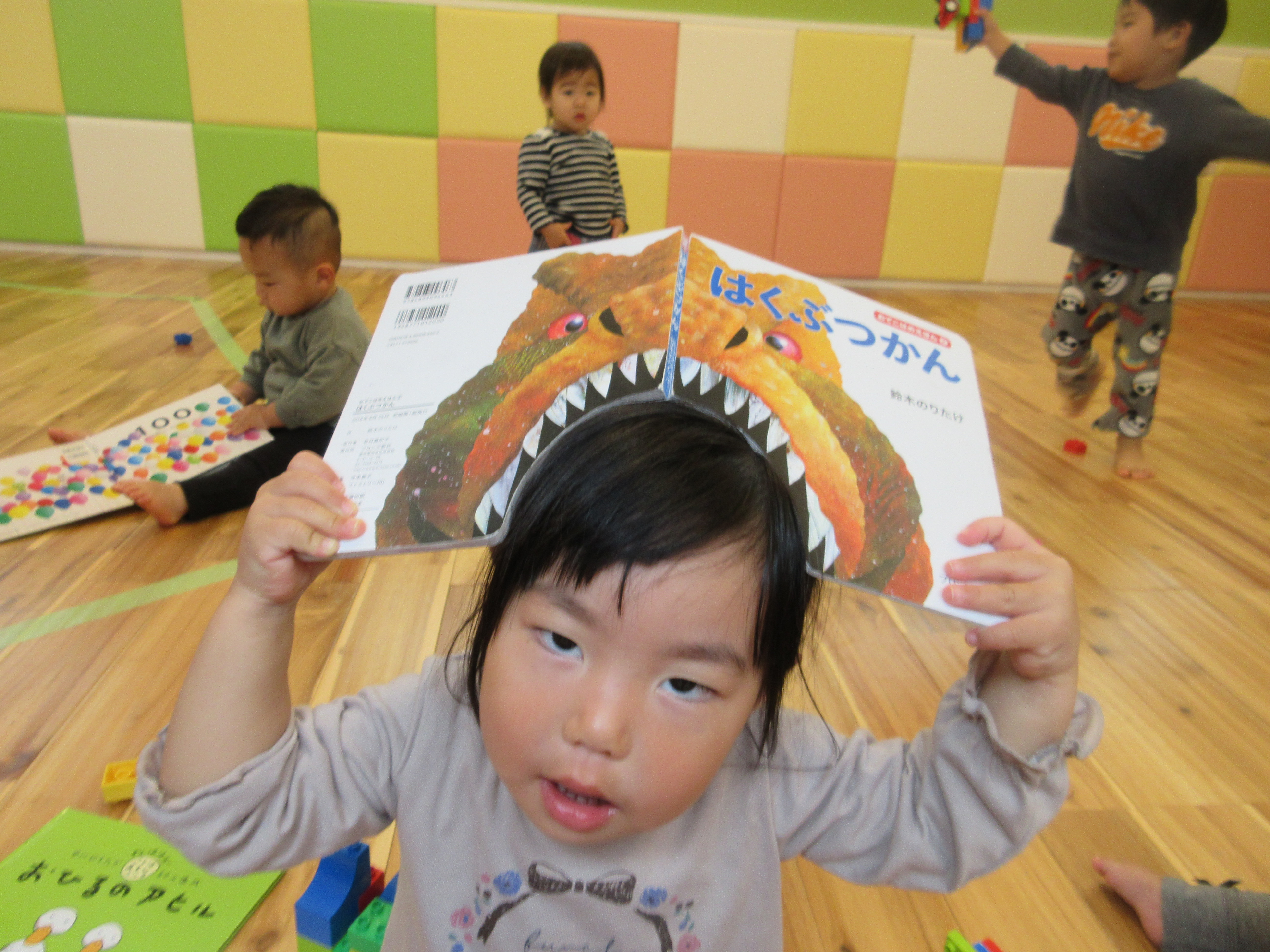 「これは、トリケラトプスだよ」とお友達にもかぶせてみたり…