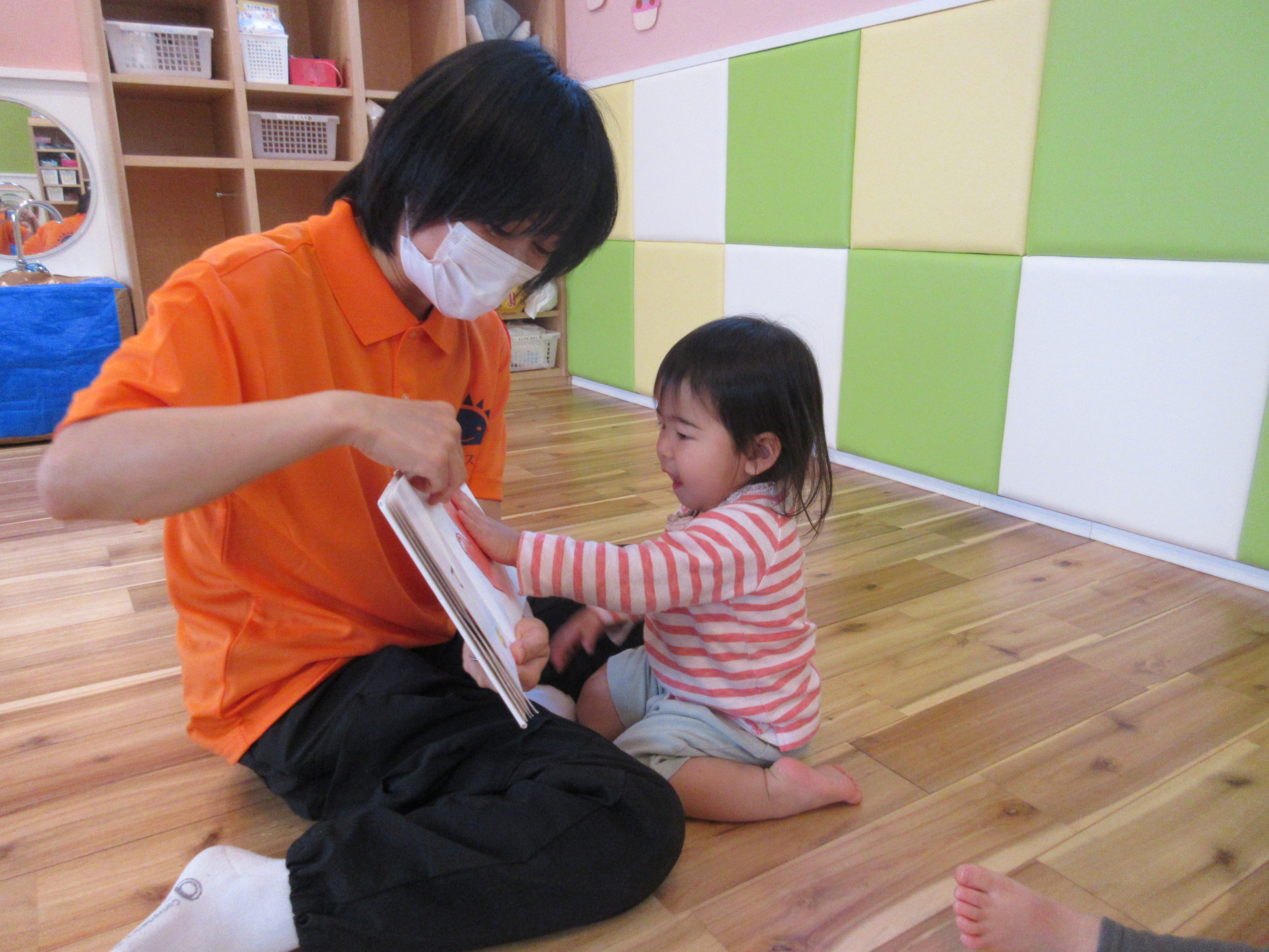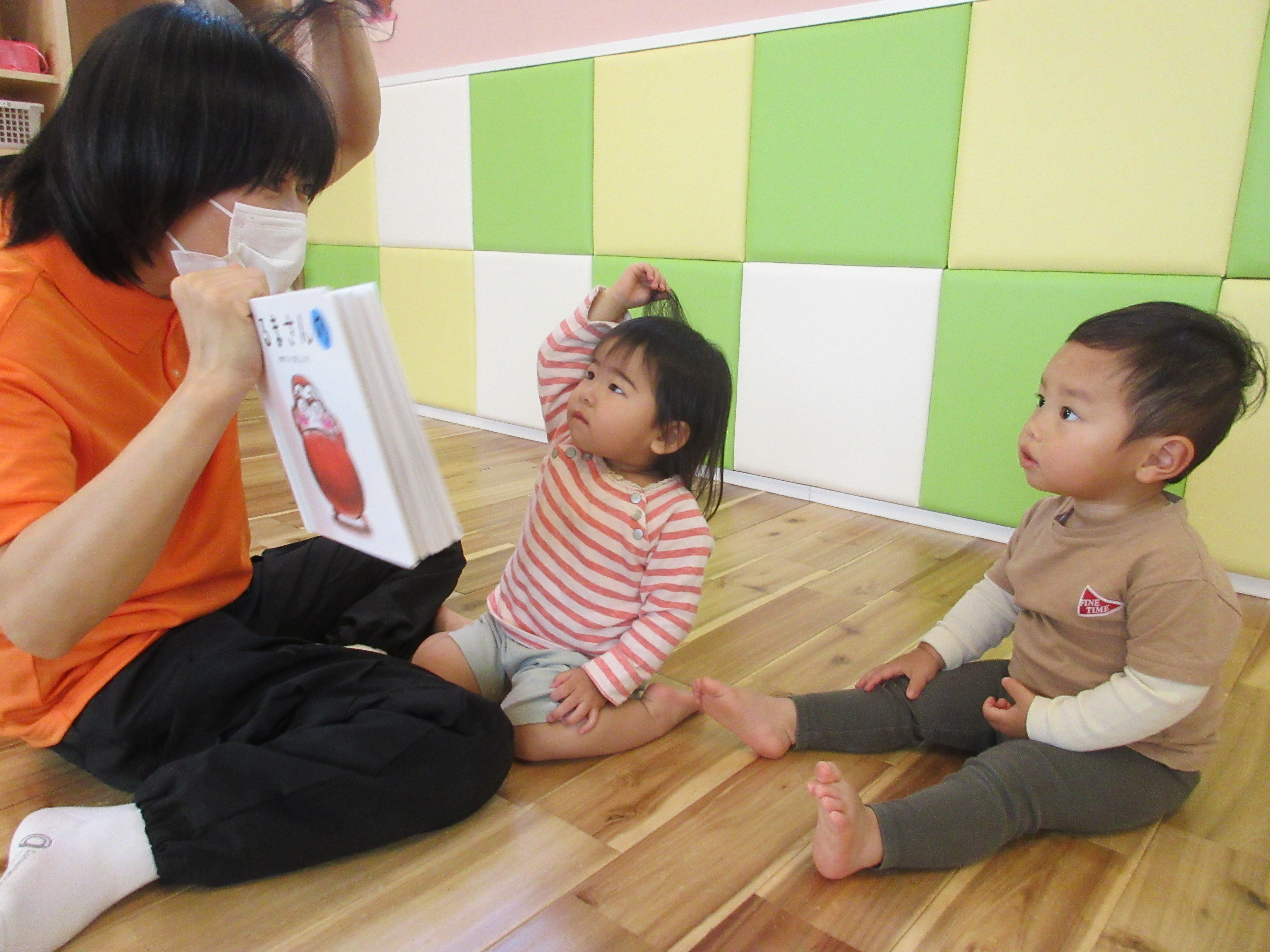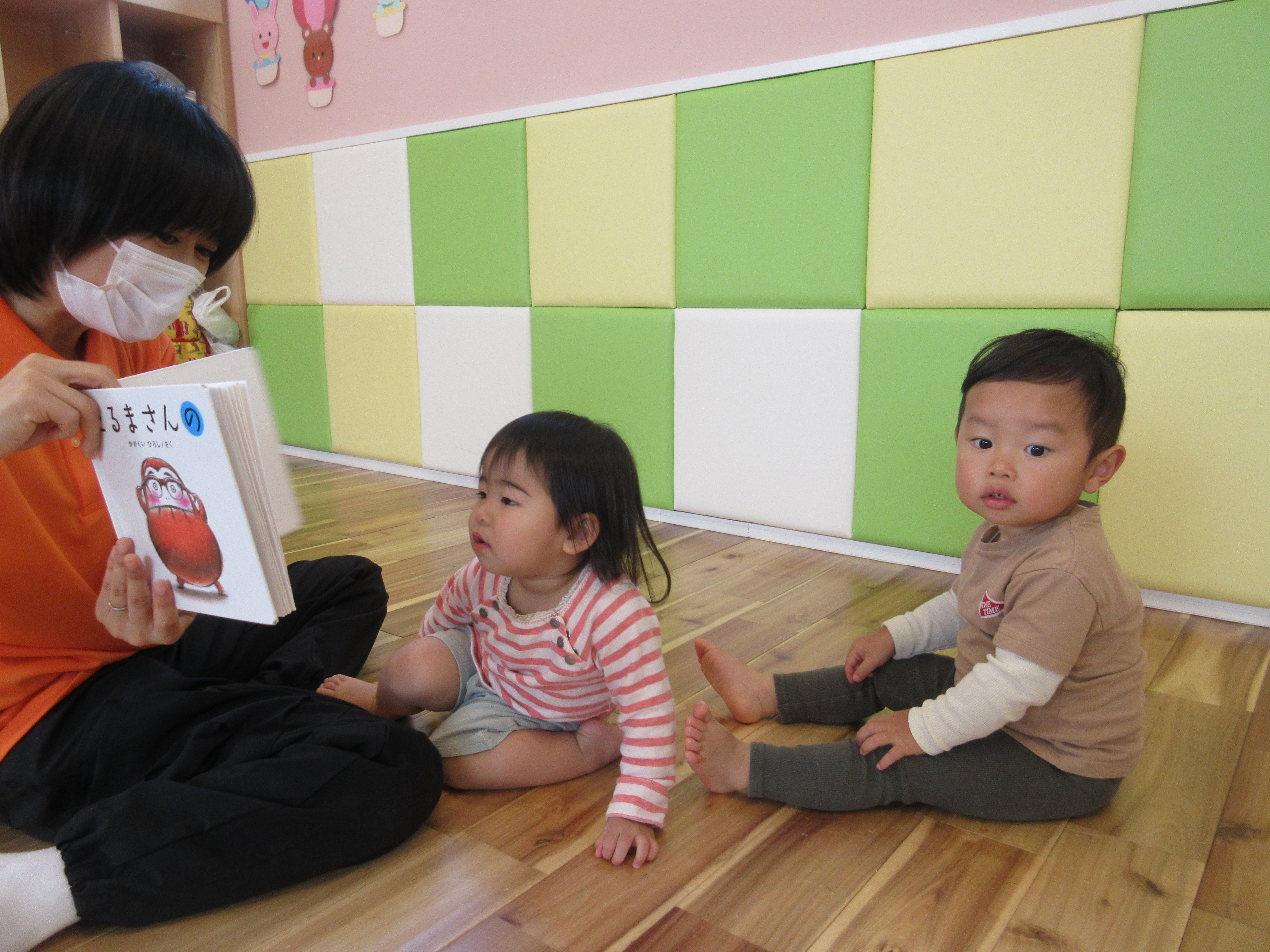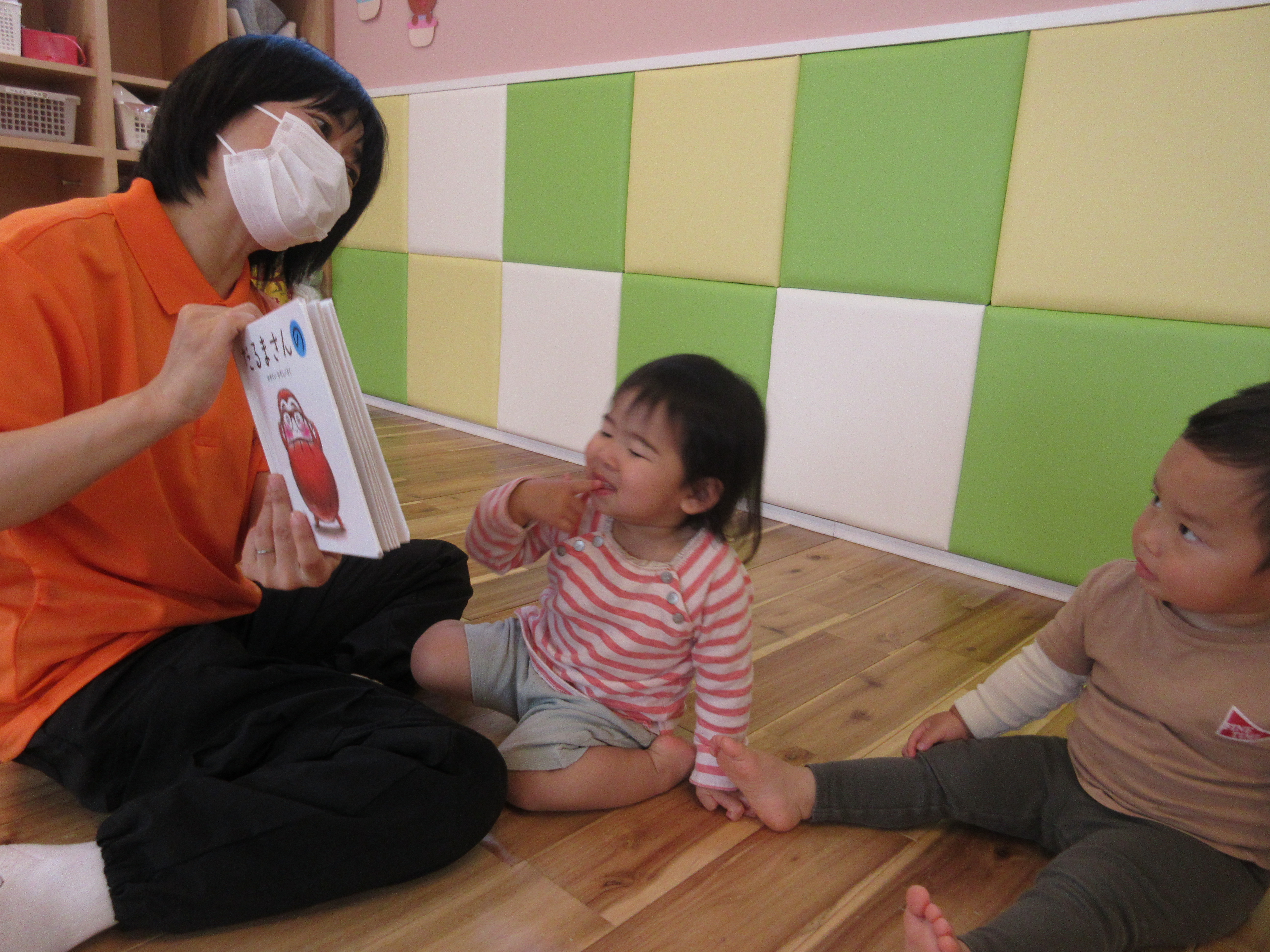 だるまさんの絵本を広げると、子ども達はだるまさんと一緒に身体を揺らしながらとっても楽しんで見ています![]()