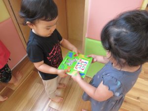 保育士が間に入ることでお友達と絵本の貸し借りもスムーズにできるようになってきました。