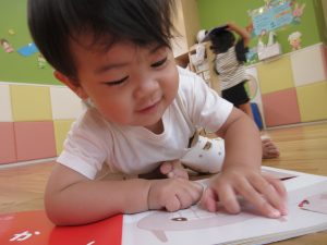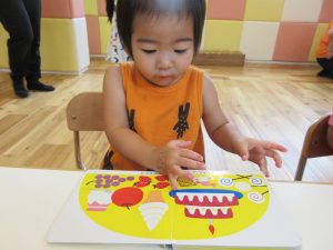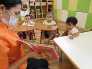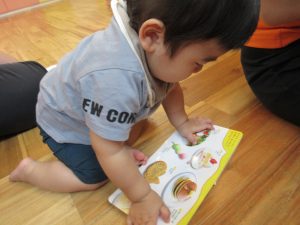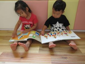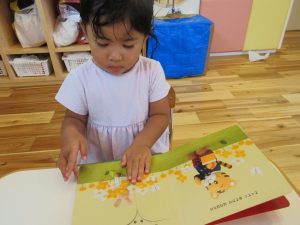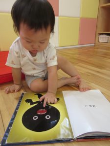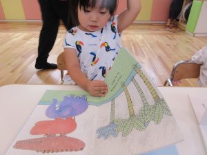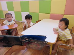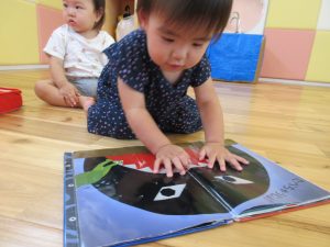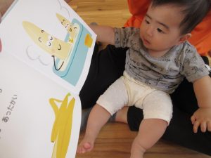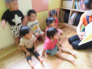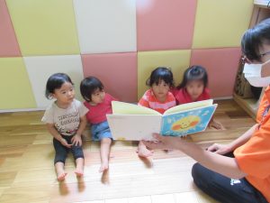 お水遊びが終わり、お食事前も落ち着いて絵本タイム