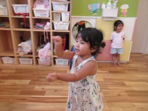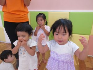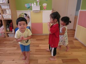 お水遊びの前には準備体操代わりの歌遊びや、みんなが大好きな