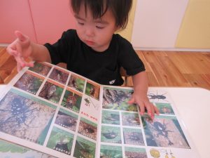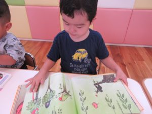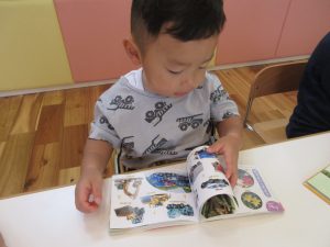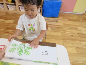 テーブルにつき、ゆっくり絵本を見たり保育士の