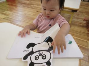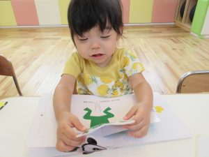 絵本を見て、保育士の歌を聞いて楽しみました。