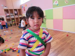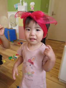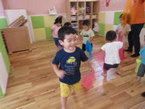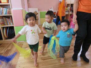 ふわふわスカーフを持つと、いつものリトミックももっと楽しくなるね