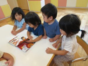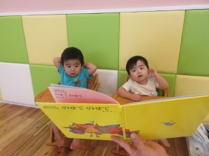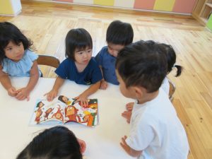 もも組さんはごはんの前に保育士の読む絵本を見ています![]()