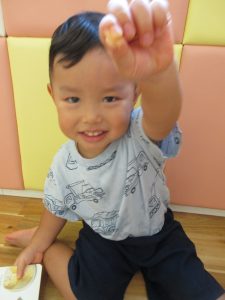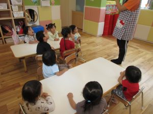 りんご組のおねえさんがもも組のお友達に