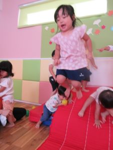 保育士がマットの高さを変えようとしていると、
