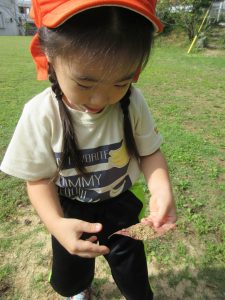 真似をしてベンチに砂や落ち葉を持って