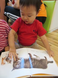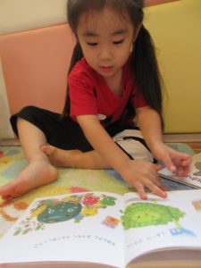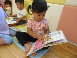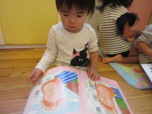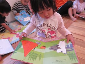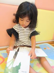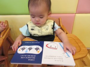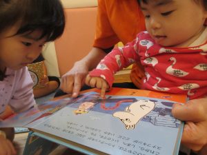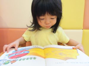 楽しい昔話の絵本に、とっても集中して