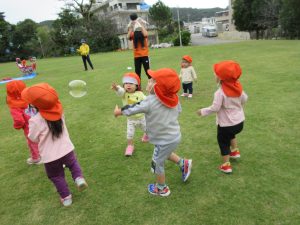 シャボン玉を追いかけ、たくさん走って