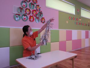 保育士が小さなヒラヒラの新聞紙に魔法をかけて