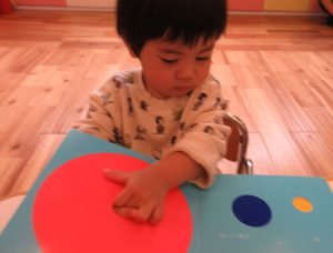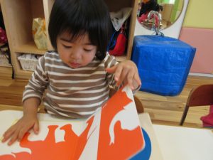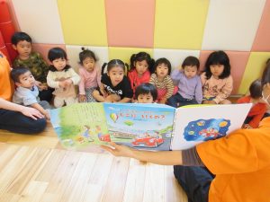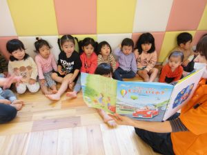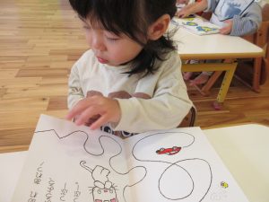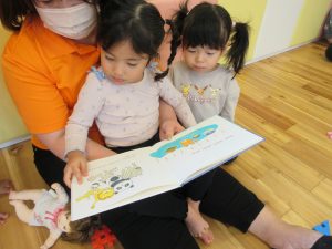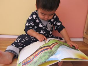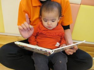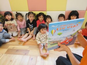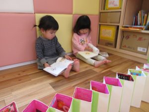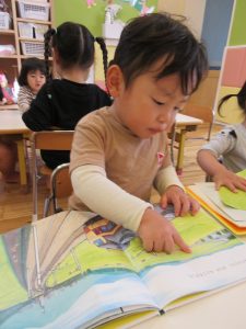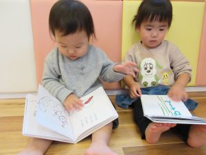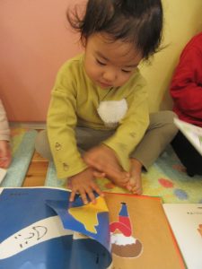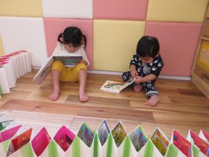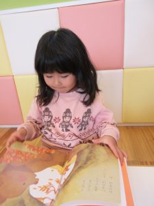 お部屋遊びなどで、積極的に絵本を楽しんでいる