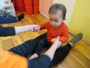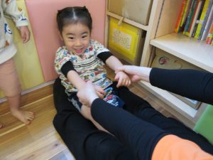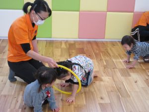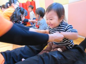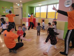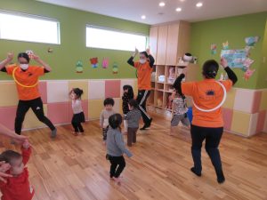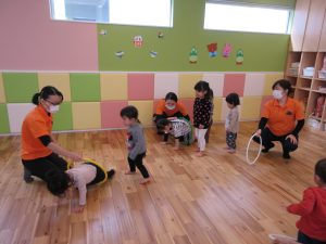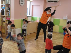 よちよち歩きのもも組さんも、体操の雰囲気を
