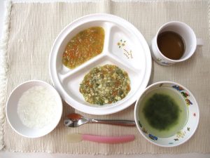 (写真は普通食になります。年齢によって盛り付け量を変えて、提供しています。)