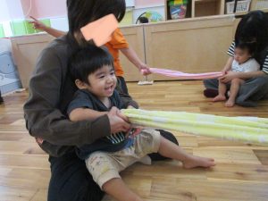 お次はタオルを使って親子ふれあい遊びで