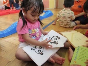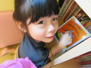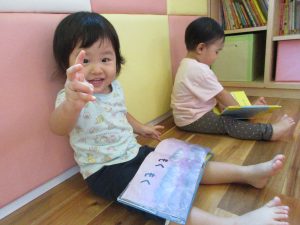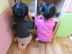 おしゃべりしながら絵本棚で何か遊んでいる2人![]()
