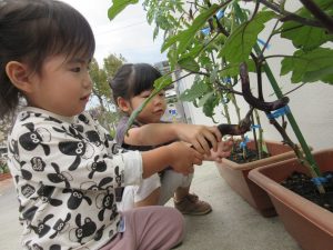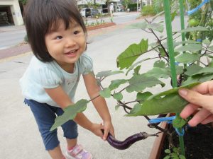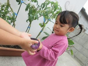 「どこにあるかな〜?あ、いた!茄子おいしいね〜」