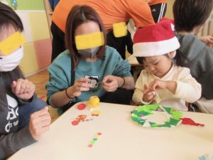 いっぱいある飾りやシールを保護者の方々と