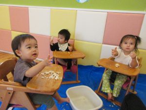 みんなで仲良く円になってパン粉粘土遊びを楽しむもも組さん