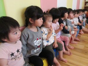 おにの絵本…?と緊張した表情でみつめる子ども達![]()
