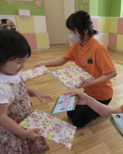 嬉しそうに手を伸ばして受け取る子ども達