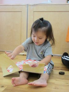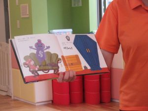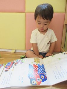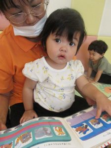 絵本の中で言われたとおり、手や声を使って絵本に触ってみます。