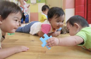 園でもお兄ちゃんお姉ちゃんたちは、赤ちゃんの近くで「かわいい〜♪」と