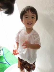 先生がシャワーのお水をかけると「きゃー」と大喜び![]()
