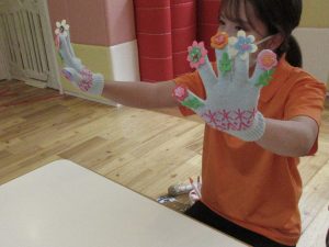 最初に先生の出し物の軍手手遊びうたが始まりました♪
