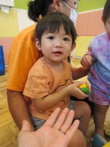 キャベツの中から〜♪のあおむしさんの手遊びをすると、