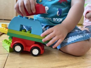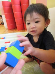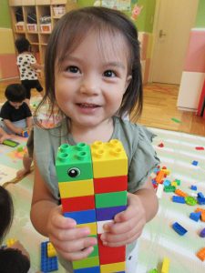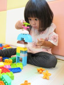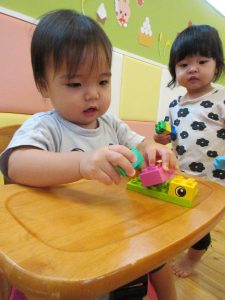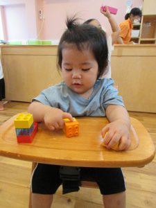 もも組さんはお椅子に座ってレゴを先生とカッチャン♪と
