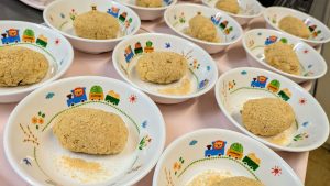 (写真は中期食です。離乳食は、離乳食の段階ごと固さ、切り方、量を変えて提供しています。)