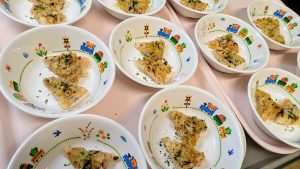 (写真は離乳食後期です。年齢によって形、固さ、盛り付け量を変えて、提供しています。)
