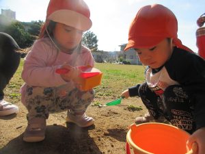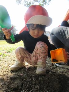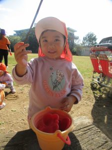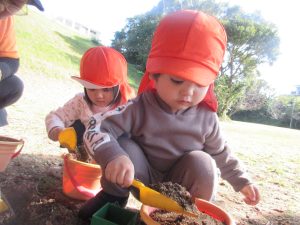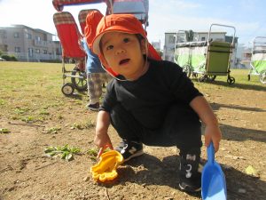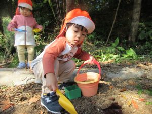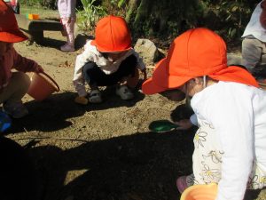 公園では、最初に木の実や落ち葉、砂場遊びをしましたよ♪