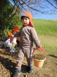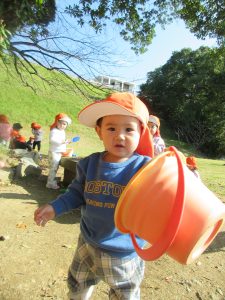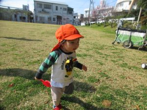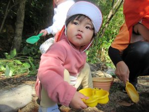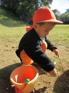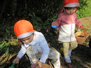 木の実や落ち葉に興味津々の子は、