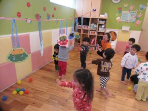 みんなで豆まきゲームをして、