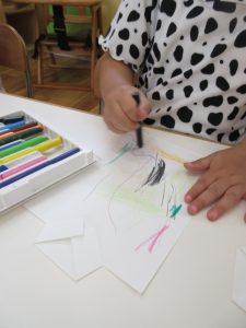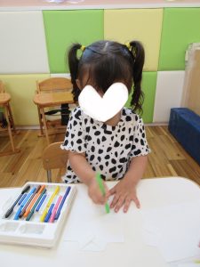 クーピーやクレヨンで画用紙のシャツに柄をつけました♪