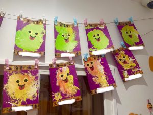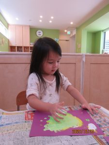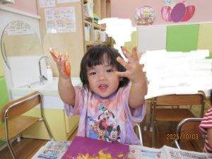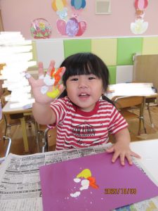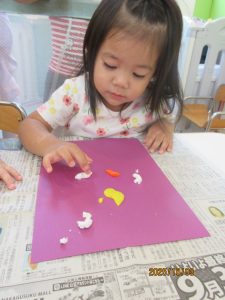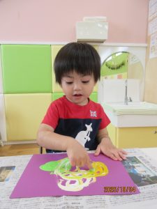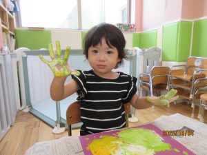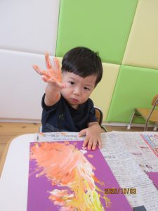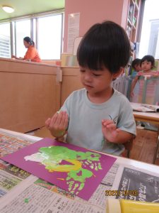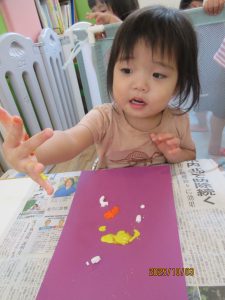 紫色の画用紙に色とりどりの絵の具でフィンガーペイントをしました![]()