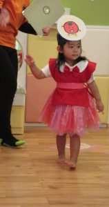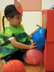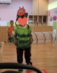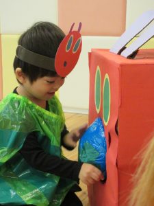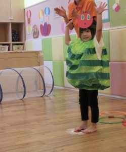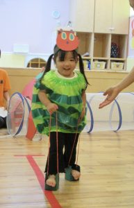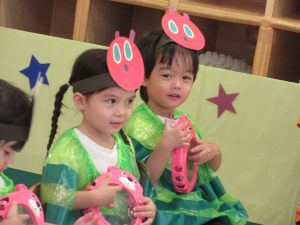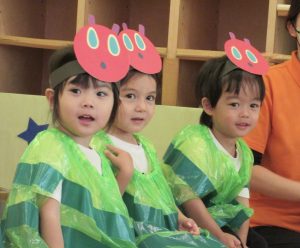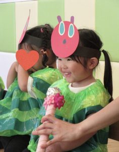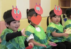 りんご組さんは「キャベツの中から」のお歌ではらこぺこあおむしになりきって入場しました
