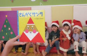 先生出し物はまず「さんかくサンタ」の絵本の読み聞かせ![]()