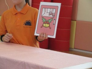 『サンタクロース』や『プレゼントの入った袋』、『眠っている男の子』などがでてきて興味深々に見つめていましたよ![]()