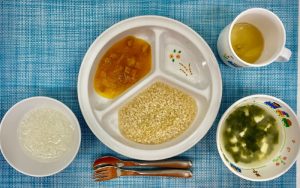 今日の給食は、鶏そぼろ丼でした!甘辛く味付けしてある鶏そぼろは、白米との相性抜群です!スプーンで上手にすくって食べていました。