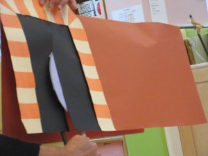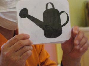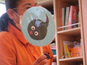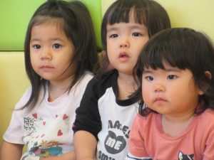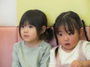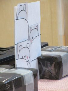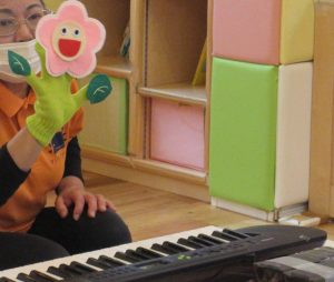 まず「おはながわらった♪」の手袋シアターや、ピアノの音に合わせて「しろいかくれんぼ」のカードシアターを見ました