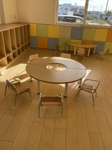 テーブルは円形のもの、四角のものとございまして、場面に合わせてレイアウトを変更し活動がしやすいようにしております。