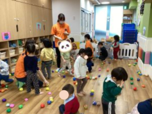 カラフルな豆代わりのボールを持ってお部屋の鬼を探します!