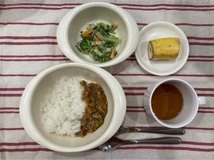ごはん キーマカレー ブロッコリーのごま和え バナナ
