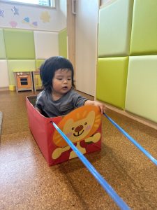 もも組さんでは、保育者の作った車に乗ってお部屋をお散歩♪